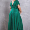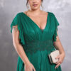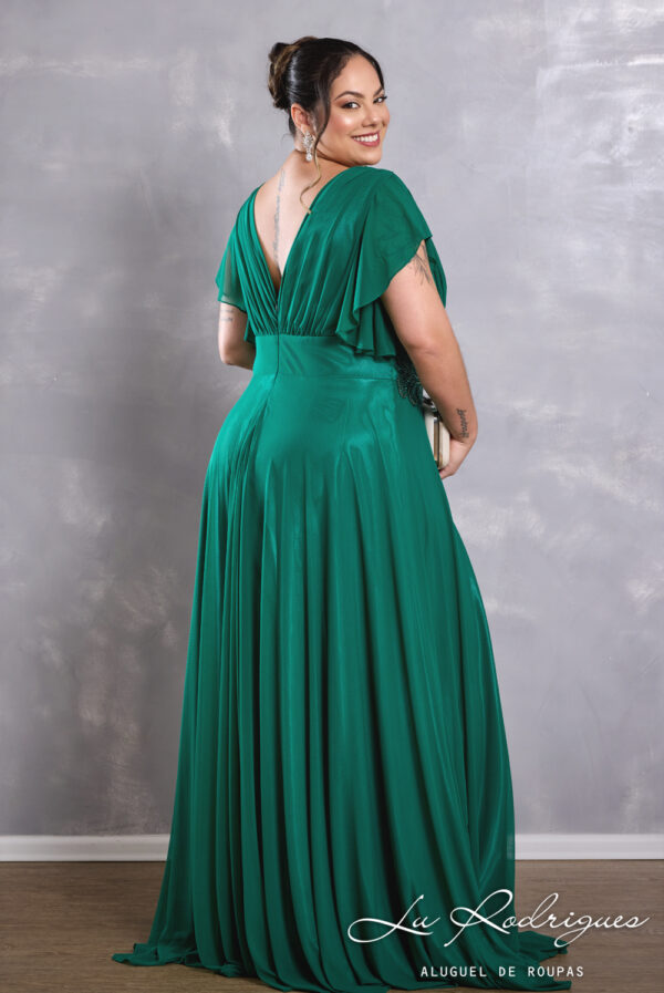 Vestido de festa plus size na cor verde esmeralda com decote em V, manga curta flare e detalhe em pedrarias na cintura. Também disponível em azul royal.