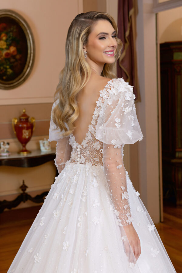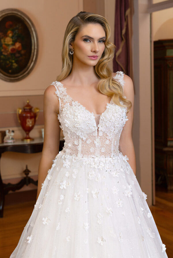 Vestido rodado, decote princesa (Branco). Saia em tela high gloss sobreposta por tule com flores 3D e bordado de micro pérolas. Corpo inteiramente bordado por miçangas, micro pérolas, micro paetês, canutilho, vidrilho e flores 3D. Barbatanas e barrado de crinol. Alças e mangas bufantes removíveis em tule com flores 3D e trabalho bordado.